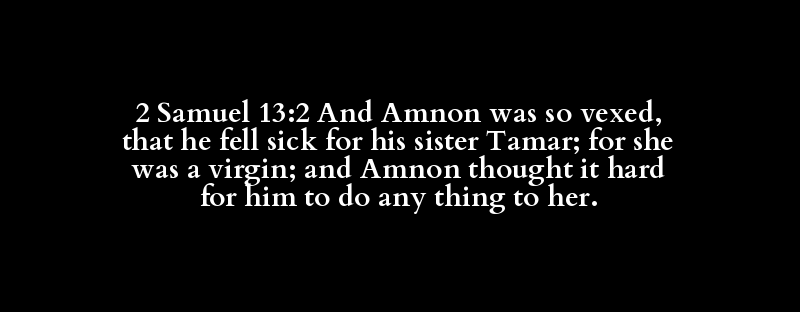 2 Samuel 13:2 And Amnon was so vexed, that he fell sick for his sister Tamar; for she was a virgin; and Amnon thought it hard for him to do any thing to her.