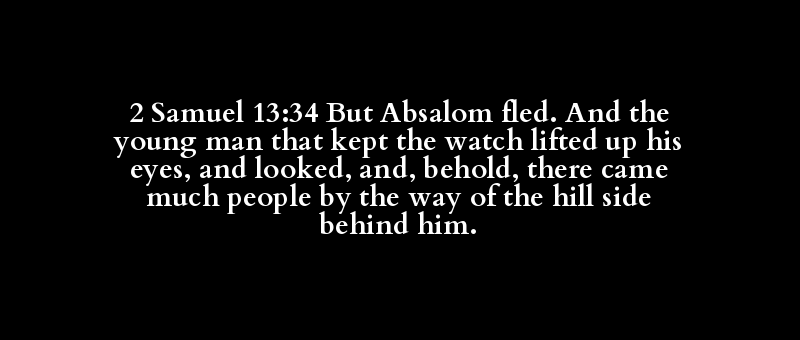 2 Samuel 13:34 But Absalom fled. And the young man that kept the watch lifted up his eyes, and looked, and, behold, there came much people by the way of the hill side behind him.
