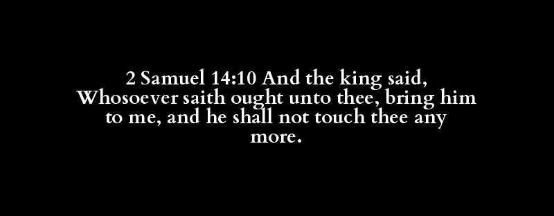 2 Samuel 14:10 And the king said, Whosoever saith ought unto thee, bring him to me, and he shall not touch thee any more.