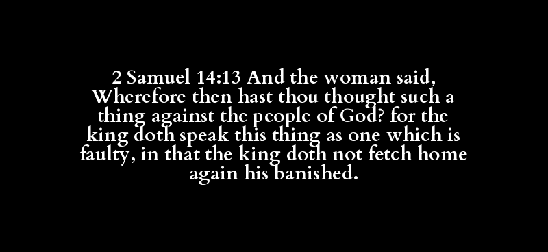 2 Samuel 14:13 And the woman said, Wherefore then hast thou thought such a thing against the people of God? for the king doth speak this thing as one which is faulty, in that the king doth not fetch home again his banished.