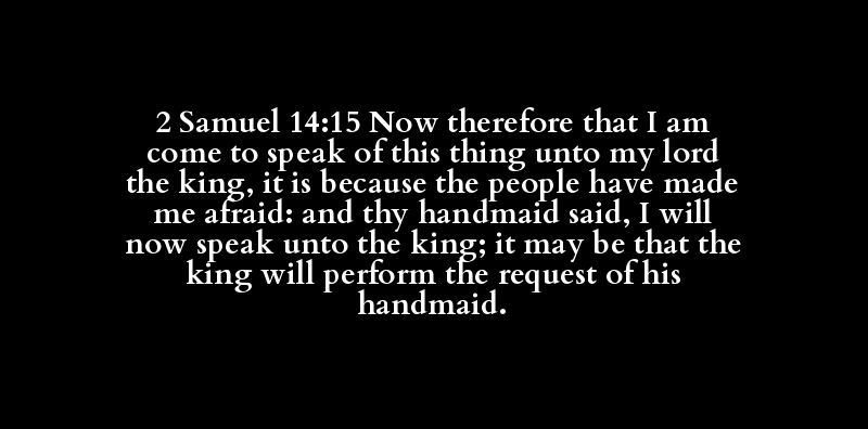 2 Samuel 14:15 Now therefore that I am come to speak of this thing unto my lord the king, it is because the people have made me afraid: and thy handmaid said, I will now speak unto the king; it may be that the king will perform the request of his handmaid.