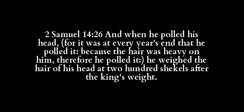 2 Samuel 14:26 And when he polled his head, (for it was at every year's end that he polled it: because the hair was heavy on him, therefore he polled it:) he weighed the hair of his head at two hundred shekels after the king's weight.