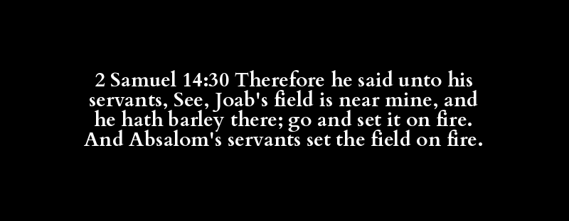 2 Samuel 14:30 Therefore he said unto his servants, See, Joab's field is near mine, and he hath barley there; go and set it on fire. And Absalom's servants set the field on fire.