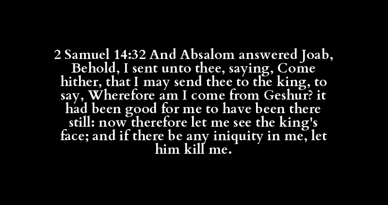 2 Samuel 14:32 And Absalom answered Joab, Behold, I sent unto thee, saying, Come hither, that I may send thee to the king, to say, Wherefore am I come from Geshur? it had been good for me to have been there still: now therefore let me see the king's face; and if there be any iniquity in me, let him kill me.