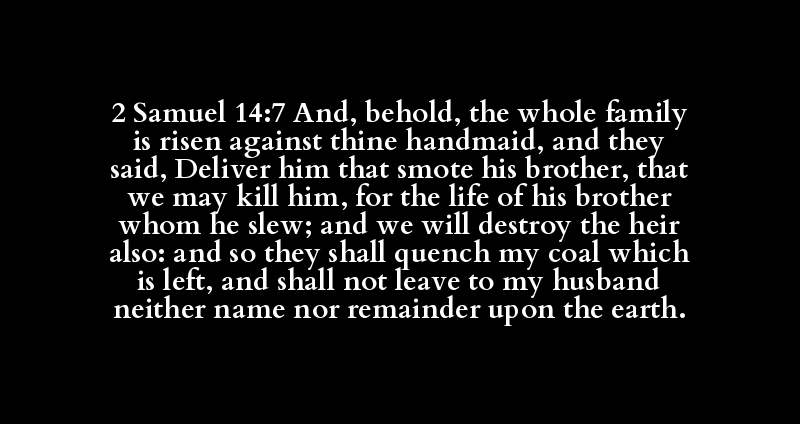 2 Samuel 14:7 And, behold, the whole family is risen against thine handmaid, and they said, Deliver him that smote his brother, that we may kill him, for the life of his brother whom he slew; and we will destroy the heir also: and so they shall quench my coal which is left, and shall not leave to my husband neither name nor remainder upon the earth.