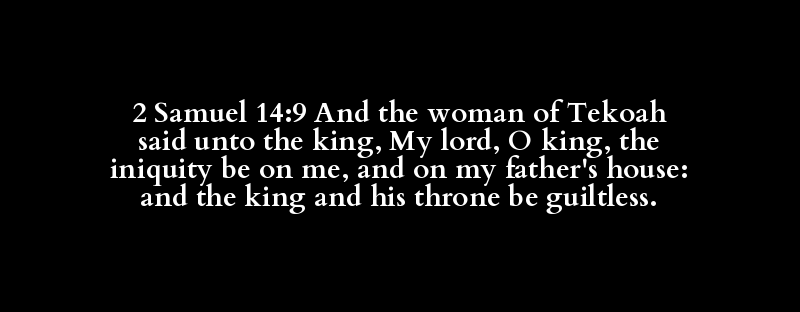 2 Samuel 14:9 And the woman of Tekoah said unto the king, My lord, O king, the iniquity be on me, and on my father's house: and the king and his throne be guiltless.