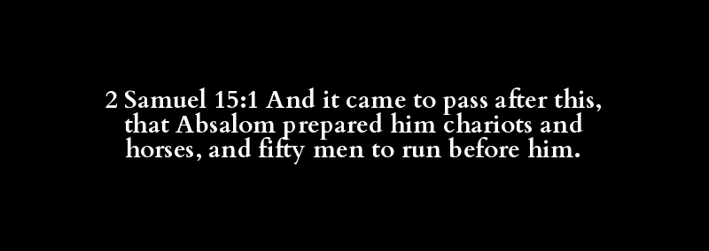 2 Samuel 15:1 And it came to pass after this, that Absalom prepared him chariots and horses, and fifty men to run before him.