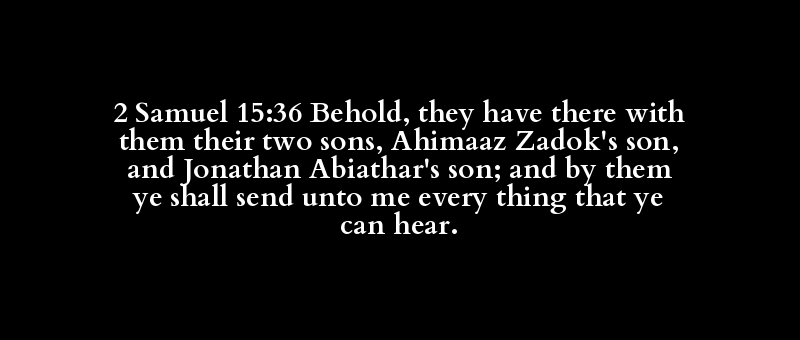 2 Samuel 15:36 Behold, they have there with them their two sons, Ahimaaz Zadok's son, and Jonathan Abiathar's son; and by them ye shall send unto me every thing that ye can hear.