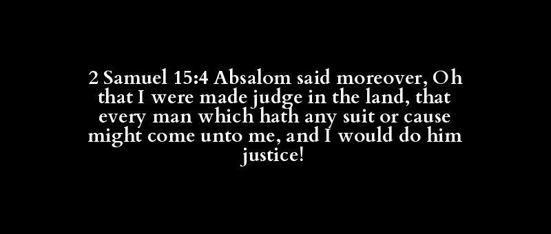 2 Samuel 15:4 Absalom said moreover, Oh that I were made judge in the land, that every man which hath any suit or cause might come unto me, and I would do him justice!