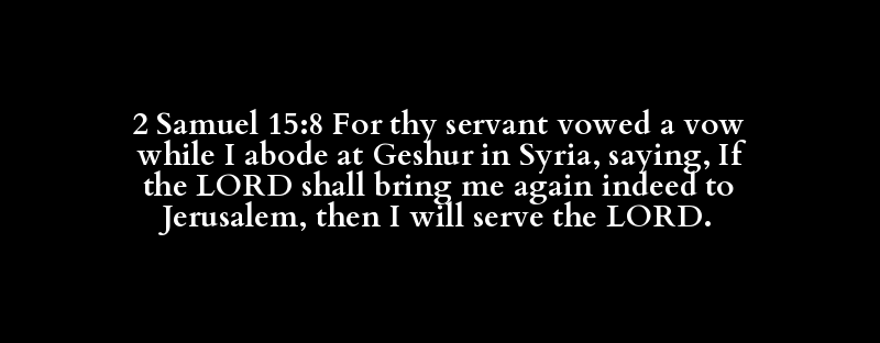 2 Samuel 15:8 For thy servant vowed a vow while I abode at Geshur in Syria, saying, If the LORD shall bring me again indeed to Jerusalem, then I will serve the LORD.