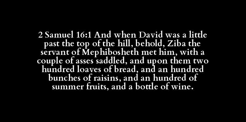 2 Samuel 16:1 And when David was a little past the top of the hill, behold, Ziba the servant of Mephibosheth met him, with a couple of asses saddled, and upon them two hundred loaves of bread, and an hundred bunches of raisins, and an hundred of summer fruits, and a bottle of wine.