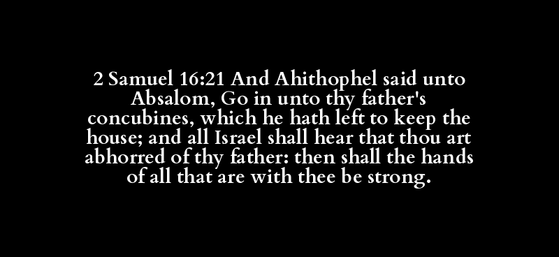 2 Samuel 16:21 And Ahithophel said unto Absalom, Go in unto thy father's concubines, which he hath left to keep the house; and all Israel shall hear that thou art abhorred of thy father: then shall the hands of all that are with thee be strong.