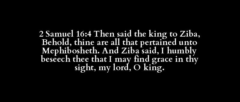 2 Samuel 16:4 Then said the king to Ziba, Behold, thine are all that pertained unto Mephibosheth. And Ziba said, I humbly beseech thee that I may find grace in thy sight, my lord, O king.