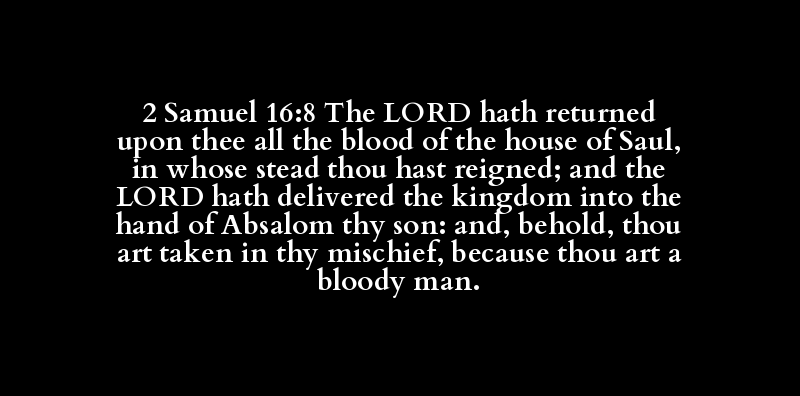 2 Samuel 16:8 The LORD hath returned upon thee all the blood of the house of Saul, in whose stead thou hast reigned; and the LORD hath delivered the kingdom into the hand of Absalom thy son: and, behold, thou art taken in thy mischief, because thou art a bloody man.