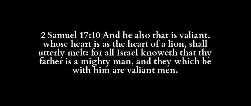 2 Samuel 17:10 And he also that is valiant, whose heart is as the heart of a lion, shall utterly melt: for all Israel knoweth that thy father is a mighty man, and they which be with him are valiant men.