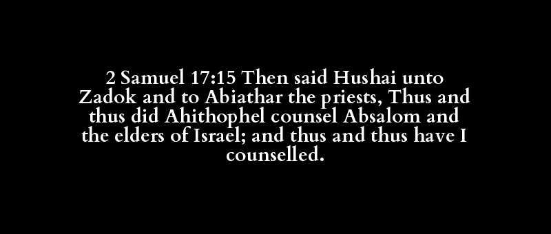 2 Samuel 17:15 Then said Hushai unto Zadok and to Abiathar the priests, Thus and thus did Ahithophel counsel Absalom and the elders of Israel; and thus and thus have I counselled.