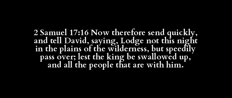 2 Samuel 17:16 Now therefore send quickly, and tell David, saying, Lodge not this night in the plains of the wilderness, but speedily pass over; lest the king be swallowed up, and all the people that are with him.