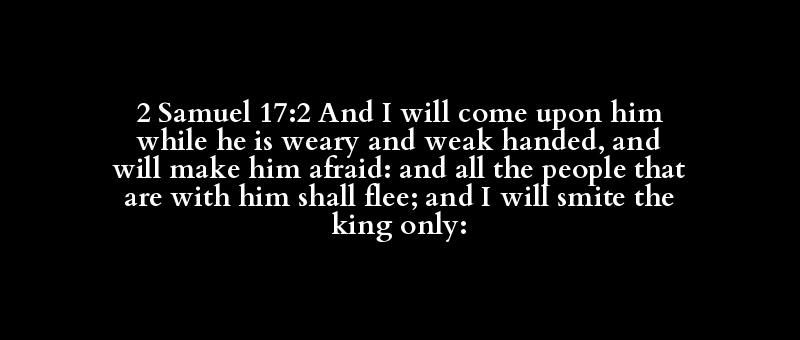 2 Samuel 17:2 And I will come upon him while he is weary and weak handed, and will make him afraid: and all the people that are with him shall flee; and I will smite the king only: