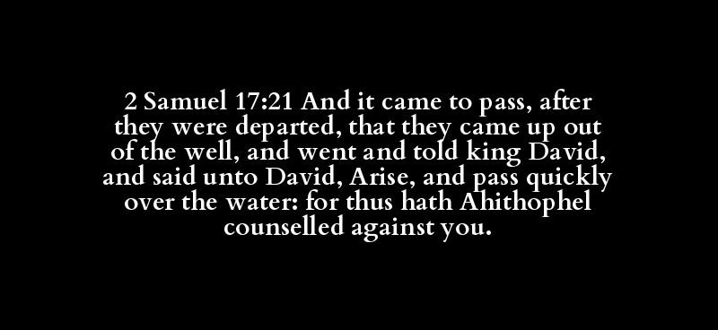 2 Samuel 17:21 And it came to pass, after they were departed, that they came up out of the well, and went and told king David, and said unto David, Arise, and pass quickly over the water: for thus hath Ahithophel counselled against you.