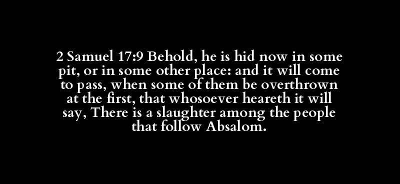 2 Samuel 17:9 Behold, he is hid now in some pit, or in some other place: and it will come to pass, when some of them be overthrown at the first, that whosoever heareth it will say, There is a slaughter among the people that follow Absalom.