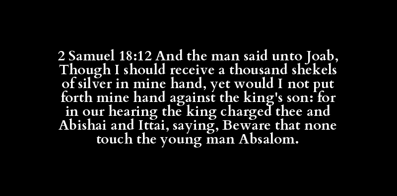 2 Samuel 18:12 And the man said unto Joab, Though I should receive a thousand shekels of silver in mine hand, yet would I not put forth mine hand against the king's son: for in our hearing the king charged thee and Abishai and Ittai, saying, Beware that none touch the young man Absalom.