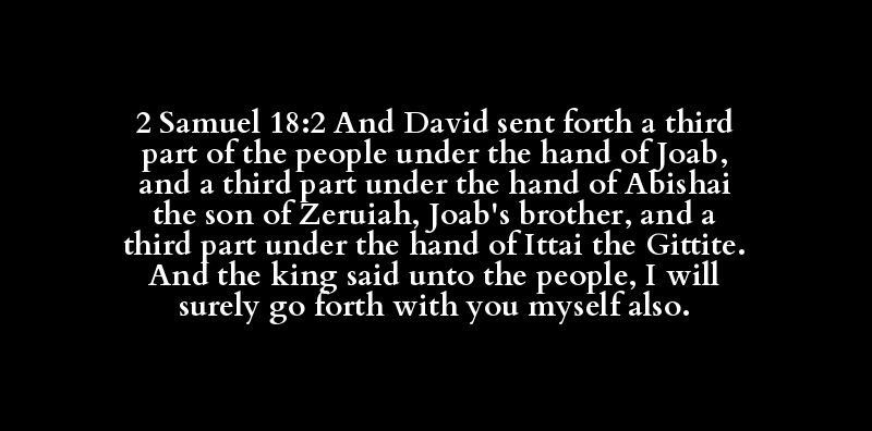 2 Samuel 18:2 And David sent forth a third part of the people under the hand of Joab, and a third part under the hand of Abishai the son of Zeruiah, Joab's brother, and a third part under the hand of Ittai the Gittite. And the king said unto the people, I will surely go forth with you myself also.