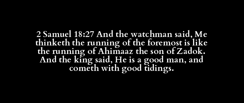 2 Samuel 18:27 And the watchman said, Me thinketh the running of the foremost is like the running of Ahimaaz the son of Zadok. And the king said, He is a good man, and cometh with good tidings.