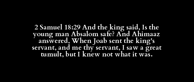 2 Samuel 18:29 And the king said, Is the young man Absalom safe? And Ahimaaz answered, When Joab sent the king's servant, and me thy servant, I saw a great tumult, but I knew not what it was.