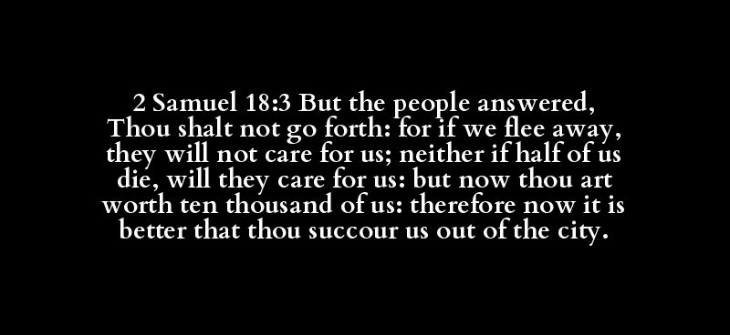 2 Samuel 18:3 But the people answered, Thou shalt not go forth: for if we flee away, they will not care for us; neither if half of us die, will they care for us: but now thou art worth ten thousand of us: therefore now it is better that thou succour us out of the city.