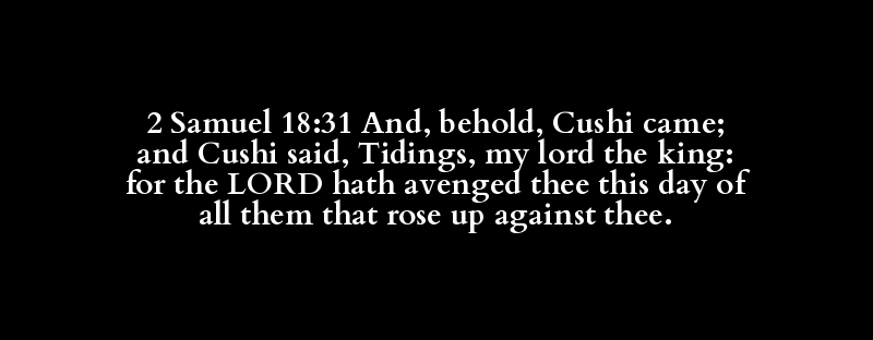 2 Samuel 18:31 And, behold, Cushi came; and Cushi said, Tidings, my lord the king: for the LORD hath avenged thee this day of all them that rose up against thee.