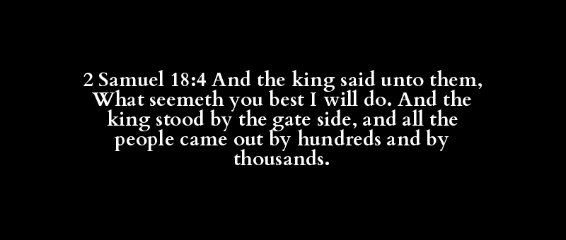 2 Samuel 18:4 And the king said unto them, What seemeth you best I will do. And the king stood by the gate side, and all the people came out by hundreds and by thousands.