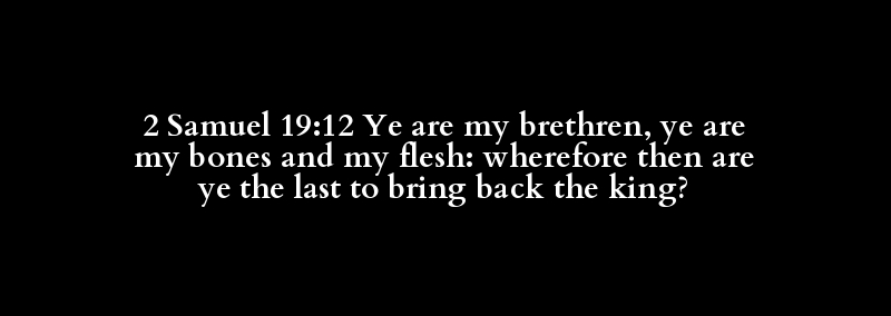 2 Samuel 19:12 Ye are my brethren, ye are my bones and my flesh: wherefore then are ye the last to bring back the king?