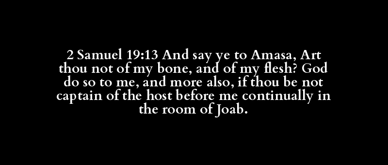 2 Samuel 19:13 And say ye to Amasa, Art thou not of my bone, and of my flesh? God do so to me, and more also, if thou be not captain of the host before me continually in the room of Joab.