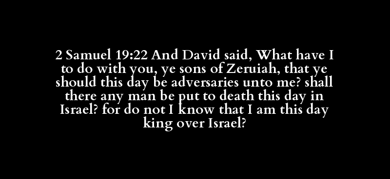 2 Samuel 19:22 And David said, What have I to do with you, ye sons of Zeruiah, that ye should this day be adversaries unto me? shall there any man be put to death this day in Israel? for do not I know that I am this day king over Israel?