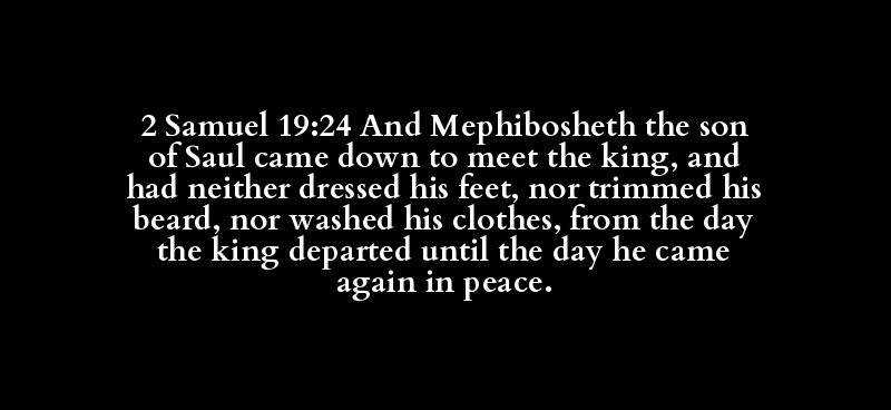 2 Samuel 19:24 And Mephibosheth the son of Saul came down to meet the king, and had neither dressed his feet, nor trimmed his beard, nor washed his clothes, from the day the king departed until the day he came again in peace.