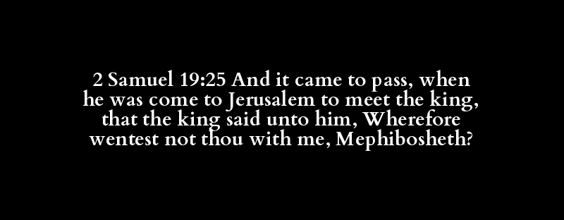 2 Samuel 19:25 And it came to pass, when he was come to Jerusalem to meet the king, that the king said unto him, Wherefore wentest not thou with me, Mephibosheth?