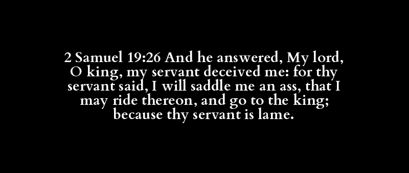 2 Samuel 19:26 And he answered, My lord, O king, my servant deceived me: for thy servant said, I will saddle me an ass, that I may ride thereon, and go to the king; because thy servant is lame.