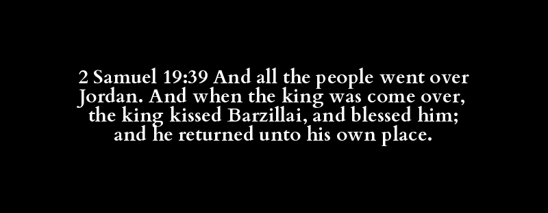 2 Samuel 19:39 And all the people went over Jordan. And when the king was come over, the king kissed Barzillai, and blessed him; and he returned unto his own place.