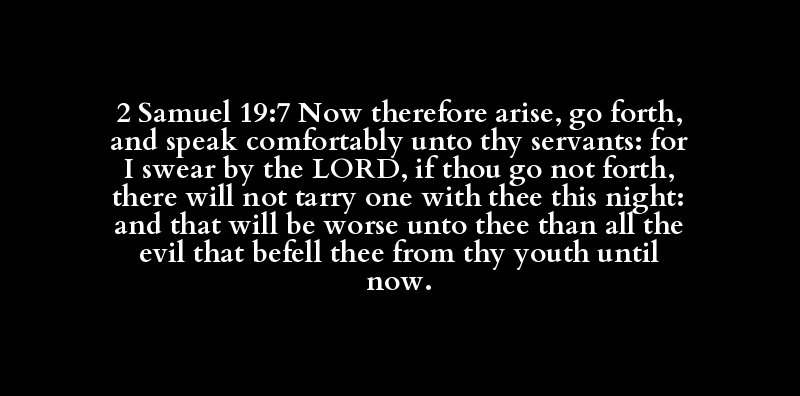 2 Samuel 19:7 Now therefore arise, go forth, and speak comfortably unto thy servants: for I swear by the LORD, if thou go not forth, there will not tarry one with thee this night: and that will be worse unto thee than all the evil that befell thee from thy youth until now.