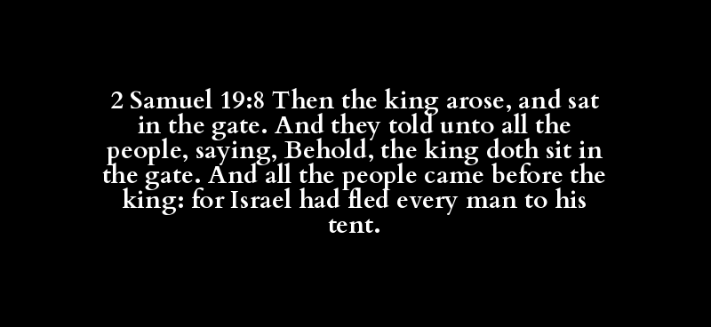 2 Samuel 19:8 Then the king arose, and sat in the gate. And they told unto all the people, saying, Behold, the king doth sit in the gate. And all the people came before the king: for Israel had fled every man to his tent.