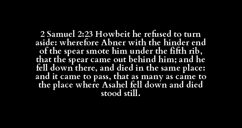 2 Samuel 2:23 Howbeit he refused to turn aside: wherefore Abner with the hinder end of the spear smote him under the fifth rib, that the spear came out behind him; and he fell down there, and died in the same place: and it came to pass, that as many as came to the place where Asahel fell down and died stood still.