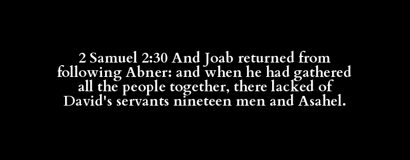 2 Samuel 2:30 And Joab returned from following Abner: and when he had gathered all the people together, there lacked of David's servants nineteen men and Asahel.