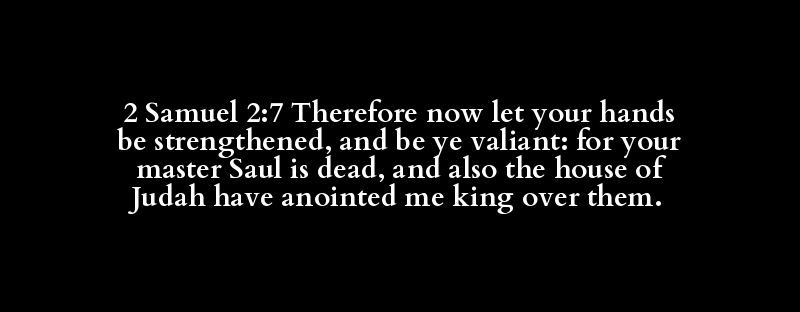 2 Samuel 2:7 Therefore now let your hands be strengthened, and be ye valiant: for your master Saul is dead, and also the house of Judah have anointed me king over them.