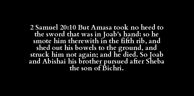 2 Samuel 20:10 But Amasa took no heed to the sword that was in Joab's hand: so he smote him therewith in the fifth rib, and shed out his bowels to the ground, and struck him not again; and he died. So Joab and Abishai his brother pursued after Sheba the son of Bichri.