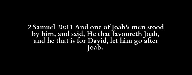 2 Samuel 20:11 And one of Joab's men stood by him, and said, He that favoureth Joab, and he that is for David, let him go after Joab.
