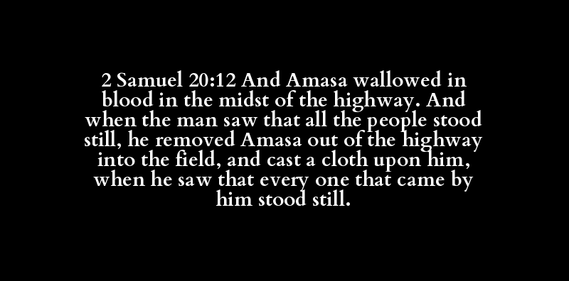 2 Samuel 20:12 And Amasa wallowed in blood in the midst of the highway. And when the man saw that all the people stood still, he removed Amasa out of the highway into the field, and cast a cloth upon him, when he saw that every one that came by him stood still.