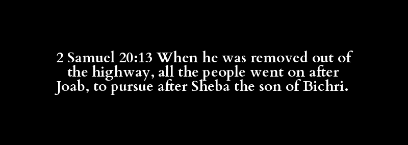 2 Samuel 20:13 When he was removed out of the highway, all the people went on after Joab, to pursue after Sheba the son of Bichri.