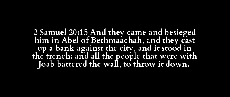 2 Samuel 20:15 And they came and besieged him in Abel of Bethmaachah, and they cast up a bank against the city, and it stood in the trench: and all the people that were with Joab battered the wall, to throw it down.