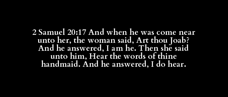 2 Samuel 20:17 And when he was come near unto her, the woman said, Art thou Joab? And he answered, I am he. Then she said unto him, Hear the words of thine handmaid. And he answered, I do hear.