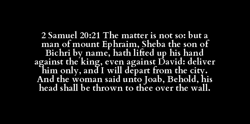 2 Samuel 20:21 The matter is not so: but a man of mount Ephraim, Sheba the son of Bichri by name, hath lifted up his hand against the king, even against David: deliver him only, and I will depart from the city. And the woman said unto Joab, Behold, his head shall be thrown to thee over the wall.